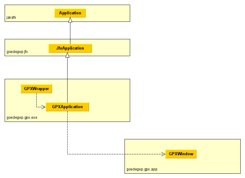The main method is in the GPXWrapper. This doesn’t do anything, except calling the GPXApplication (that why it’s called a wrapper). The reason for having this wrapper is a problem with JavaFx in an executable. If the main class is the subclass of javafx.stage.Stage, the executable doesn’t do anything.
